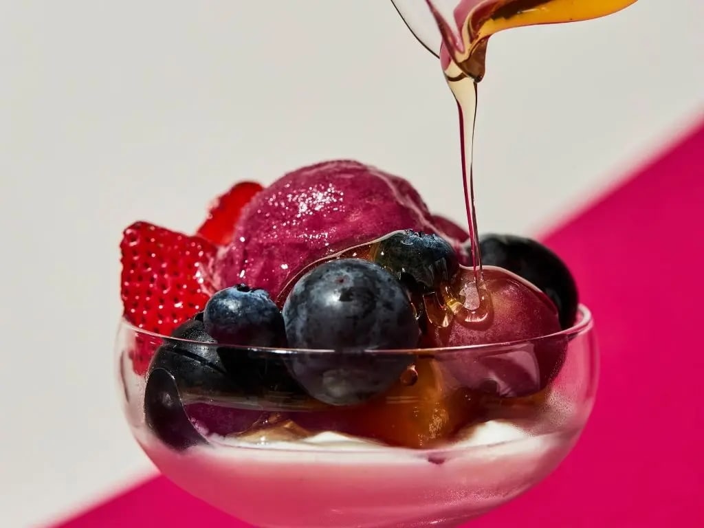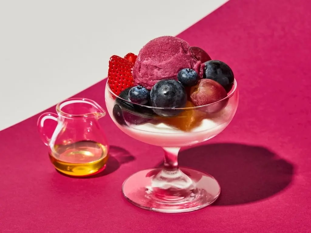 フルーツの彩りとヨーグルトの純白が美しく調和する、秋の一皿。巨峰シャーベットとフルーツの爽やかな酸味を、ヨーグルトの優しい口あたりが包み込みます。仕上げにははちみつをとろりとかけて、まろやかな甘さとともにお楽しみください。